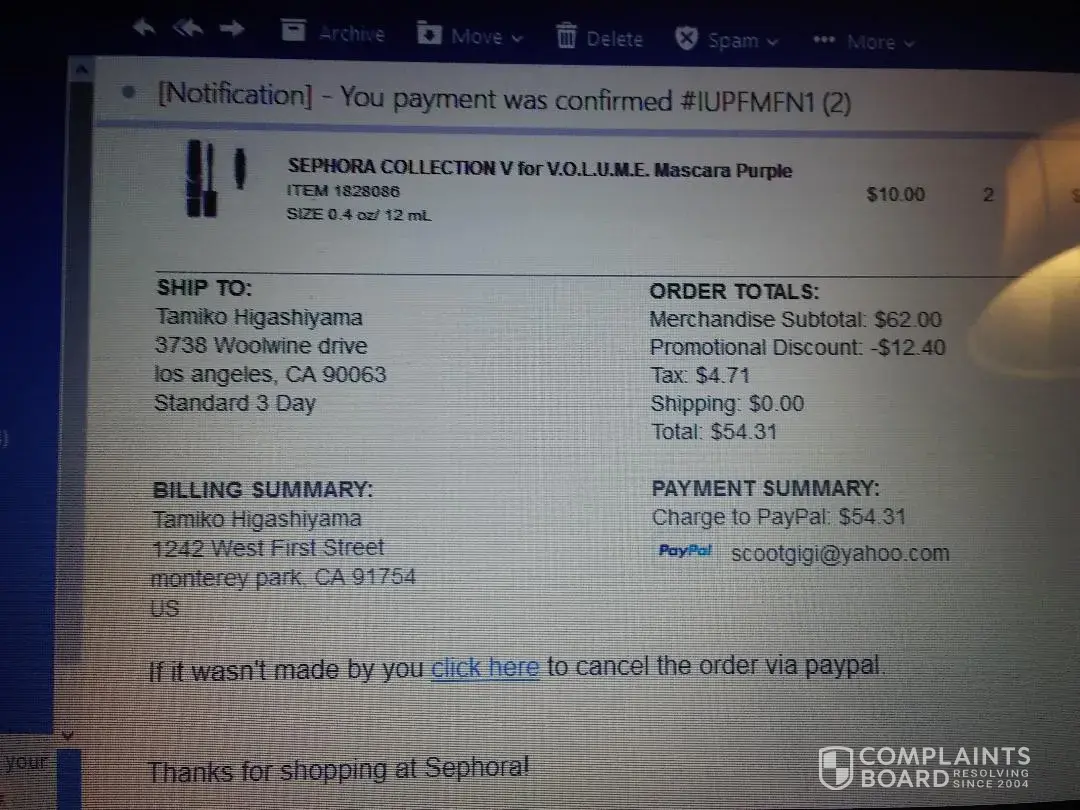 I just received notification that an order was placed on the above website and company using an old existing PayPal account. I have only used a pay pal account some years ago for an order on ebay due to the method of payment I was trying to pay with was not accepted. I have not used ebay or Paypal in years. I am trying all that I can to fix and clean up my credit from being married to my ex-husband! I do NOT ned this kind of service to continue. I have attached my response to said email. I do have an email address [protected]@yahoo.com. I do not know how someone else has been able to use the same email since I have had this one for at least 15 yrs. please remove any other email accounts that have the same address that I just listed. My name is Regina Little and the names I have used in the past are: Regina L. Woodruff, Gina Little, Gina Woodruff. My D. O. B. is 04/16/1967. Pictures attached are in order 1-4. That name on the shipping and billing is not my name or address. I tried to send a reply to the email but it came back as mailer domain not available. My computer scanned it as maliscious as well. THIS IS NOT MY ORDER OR ACCOUNT! REMOVE ALL THIS CRAP AND ANY OTHER STUFF ASSOCIATED WITH MY EMAIL! DO THIS NOW AT ONCE! IF YOU DO NOT MY LAWYER WILL BE CONTACTING THE BUYER, SELLER, PAYPAL, THIS WEBSITE, THIS COMPANY AND ITS ENTITIES! I HAVE ALSO ALERTED YAHOO OF THIS SCAM! GO MESS WITH SOMEONE ELSE THAT IS WEAKER AND DUMBER THAN ME! Please help me!