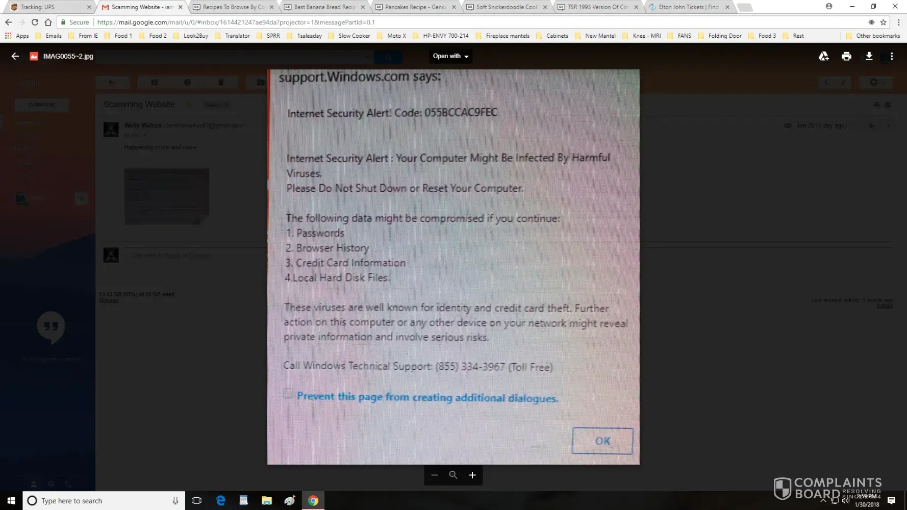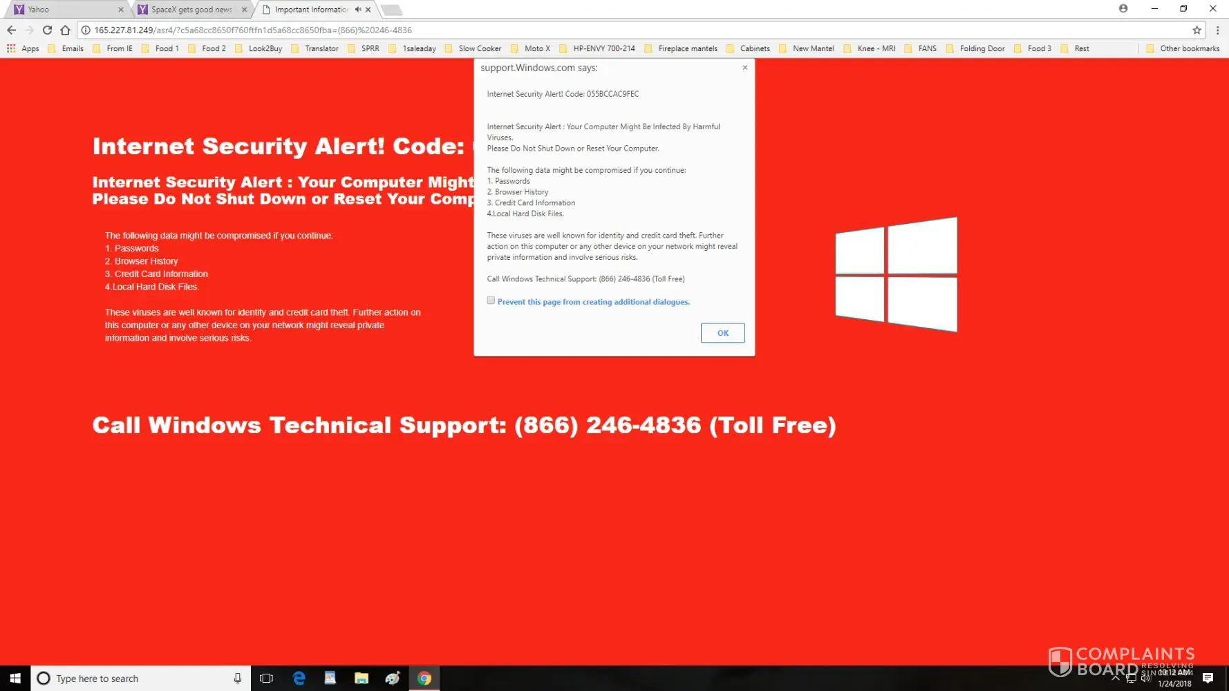 When I link off of your news articles, and this is happening more and more, instead of the feature opening, I get this webpage that may or may not lock my ability to close it. At the top it says: "internet security alert! Code... Then has a box to the side saying that my computer may be infected by harmful viruses. Do not shut down my or reset your computer. It gives a phone number to call for windows technical support: [protected]. Sometimes I can"x" out of the tab and sometimes not. When I can't I just power off my computer, wait, and then power back up again. I then run my virus and my malware checkers. A friend in newcastle, ca, a friend in minnesota, a friend in syracuse all have gotten this and they were all on yahoo news feeds. I told them to just power off the computer, etc. As I mentioned, this is happening more and more on your webpage and hackers have gotten into your system. Please see attachment of their webpage. I am sure when called, they will want money to release your browser. This scamming is not a good reflection upon yahoo. But myself, I am getting tired of it to where I want to switch news feeds, possible to msn or aol. I hope you can do something to stop this.