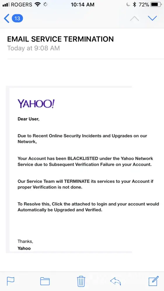 I received an unusual email from your company that my yahoo account will be terminated (Subject: Email service termination) and then I need to update by clicking the - upgraded and verified .Can you please let me know if this email letter is coming from Yahoo Company not from Spam or Hackers? My yahoo account is [protected]@yahoo.com