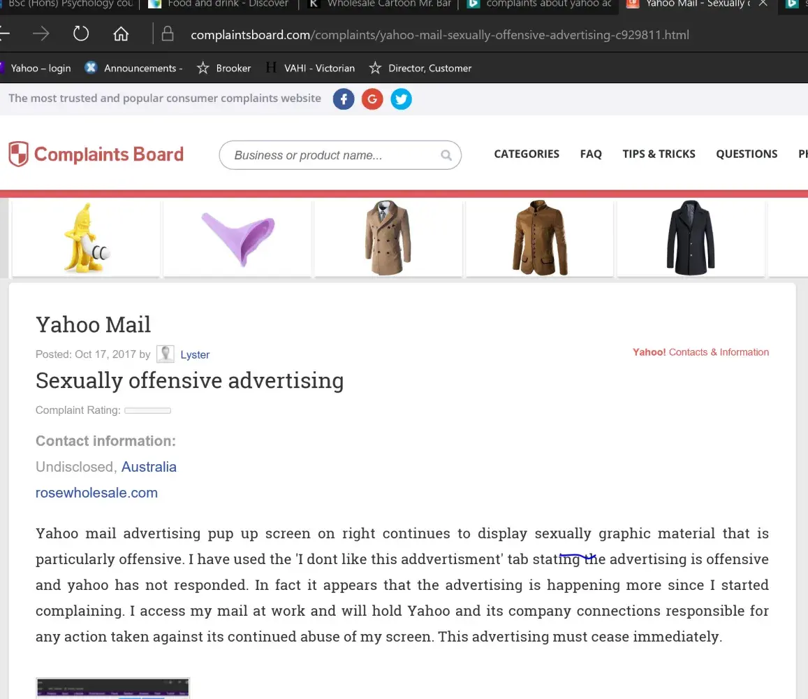 Yahoo mail advertising pup up screen on right continues to display sexually graphic material that is particularly offensive. I have used the 'I dont like this addvertisment' tab stating the advertising is offensive and yahoo has not responded. In fact it appears that the advertising is happening more since I started complaining. I access my mail at work and will hold Yahoo and its company connections responsible for any action taken against its continued abuse of my screen. This advertising must cease immediately.