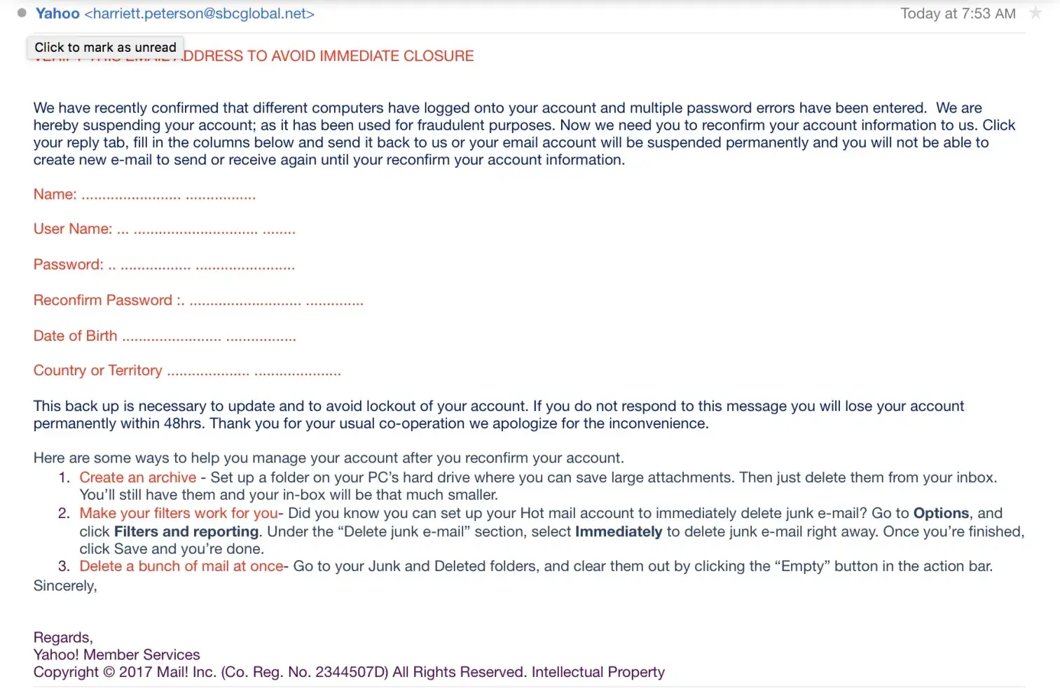 I just wanted to confirm this is a fake Yahoo email and bring it to your attention that it is circulating. I am concerned that this is someone trying to extract personal information for fraudulent activity. I would appreciate Yahoo keeping a more vigilant filter on such emails. Thank you.