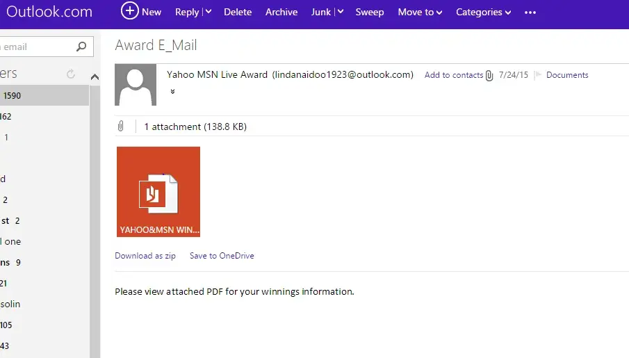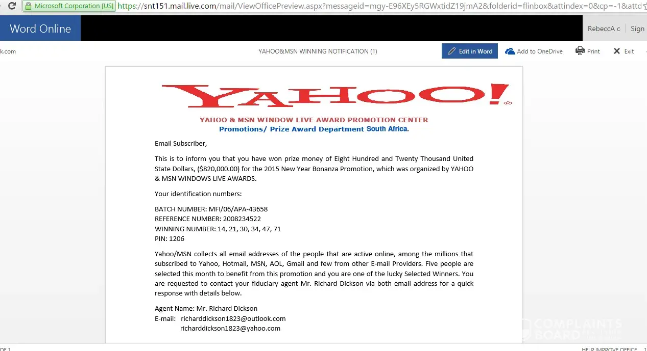 On August 7, 2014, I received an email from Yahoo & MSN Windows Live Promotion Awards. It stated I had won $820.000.00. I checked this out on the Internet and it turns out to be fraud. His name is Mr. Richardson Howard. Also named in this email is Mrs. Taylor M. Lopez. Mr. Richardson has asked to send personal information about myself to claim the prize. I did not send him any information. His email address is [protected]@yahoo.co.za. Something should be done about this. Thank you