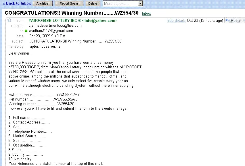 Congratulation from the office of the yahoo / msn / gmail national lottery.