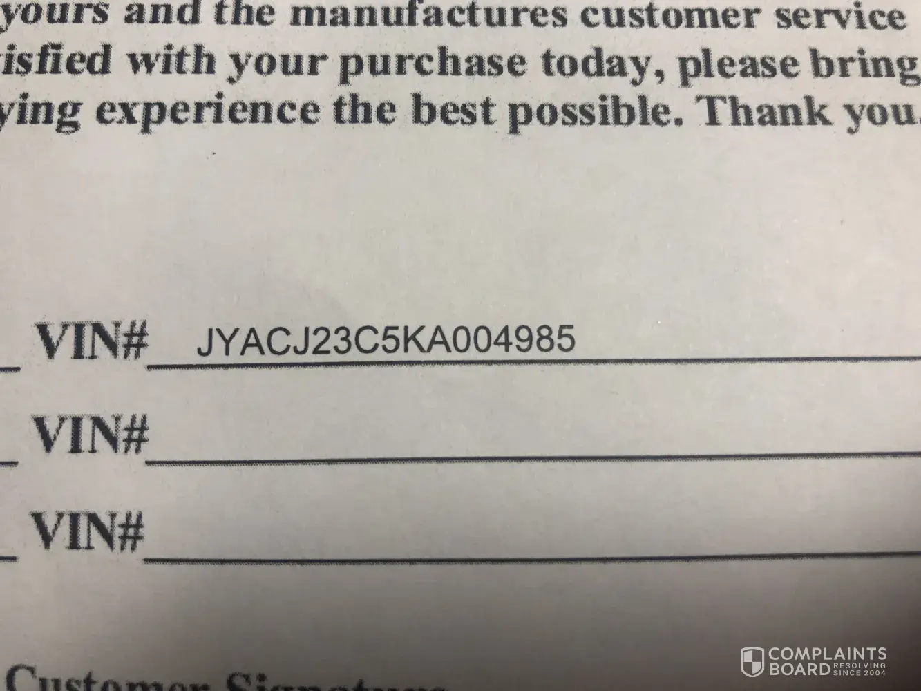 Purchased this product originally on 9/18/2019 as a surprise gift for my husbands 50th Birthday. The dealership, Ridenow Powersports in Jacksonville, Florida increased the price on my contract for the 2019 Yamaha YZ450F to $8, 8990 from their advertised price of $7, 299.00. I realized the problem the next day and called the dealership who told me that the sales person I purchased from was terminated the same day. I went to the dealership in which the Manager "Zach" told me that price gouging and deceitful acts was the reason that the employee, Taylor Frankie, was terminated. They revised my contract to the advertised price. Delivery of the Yamaha YZ450F, after numerous calls and resistance, was scheduled to be delivered this past Thursday, October 3, 2019 in which I was sent an email confirming, My the dealership "Management". It was to be delivered after 1:00pm and he would confirm with me in 5e morning to set up a more specific time. He did not call and after numerous calls to him, I asked the receptionist to please walk over to his desk and ask him to get on the phone. This was approximately 3:45pm on 10/03/2019. He finally did and stated that he still needed to "check over" the YZ450F and that the delivery truck was still out on another delivery and he would let me know when they were on their way. He did not let me know and 4 hours later, two gentlemen showed up in a personal vehicle and unloaded what we thought was out Brand New 2019 Yz450f. Then just drove away. They stated they were from a completely different dealership in Gainesville, not the original purchase location. The YZ450F they basically rolled off their personal vehicle is NOT the YZ450F I purchased, the Vin Numbers DO NOT MATCH and it does not Start. This product is NOT New, It has been used and does NOT match what we have signed a contract for. The dealership acknowledged they DO NOT HAVE the one I purchased and "Thought" this would suffice. Needless to say it does NOT and we have a signed contact without our purchase. The Ridenow Jacksonville Florida said they "Went ahead and changed the Vin on my file" to match this item I did not buy, which is illegal for them to do. We do not know what our option are and they have provided no resolution.