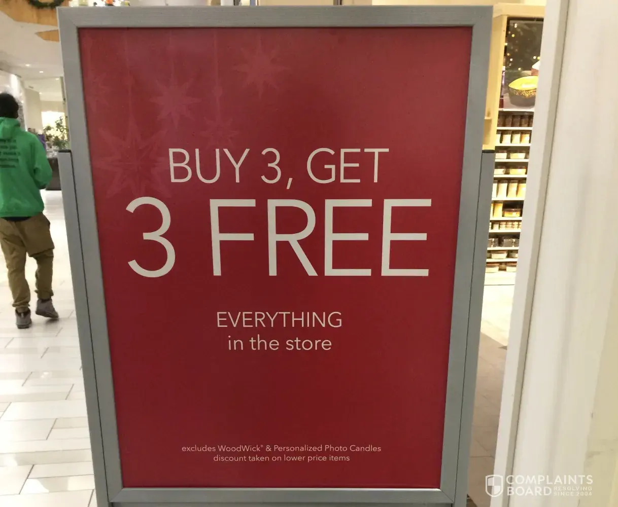 Today I was shopping at the Yankee Candle store at the Holyoke Mall location. While shopping, I noticed a sign that read "Buy 3, get 3 free EVERYTHING in the store (picture below). After reading this, I proceeded to ask an employee on the floor if the small tumbler candles were included in this offer seeing as they were on sale at $5 a candle. After asking this, the employee assured me that these were part of the deal and that the only items excluded on the deal were the Woodwick and Personalized Photo Candles as displayed on the signs that were all over the store. As I got to the checkout, the cashier informed me that the six candles that I had were in fact not included in the "Buy 3, Get 3" deal. She then refused to give me the deal even though I was quoted by another employee. I found this to be very misleading, as I told her that one of the employees in the store had told me that these were indeed part of the sale after showing her the exact candles that I brought to the register with me. I'm very disappointed in the service I received today at this location.