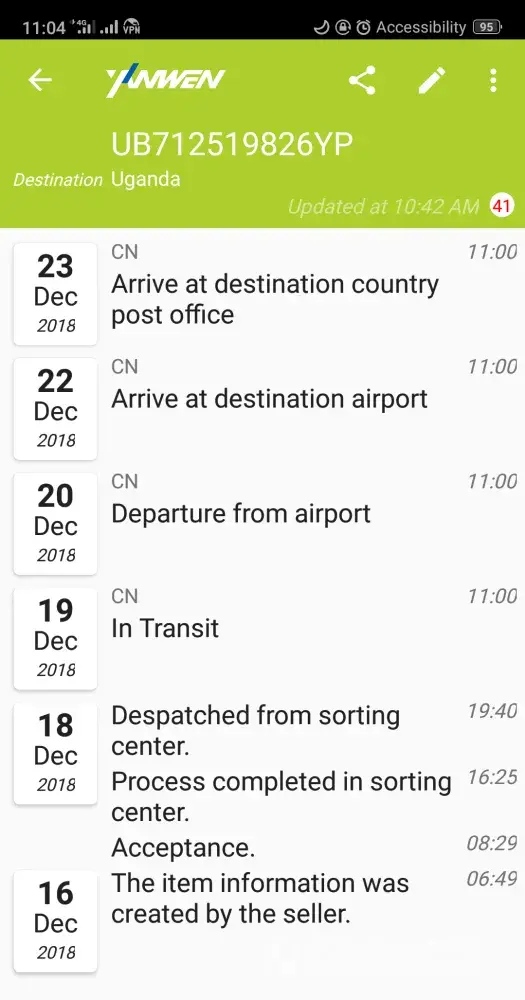 Hello I bought a watch from china and it was sent to me in Uganda through you(Yanwen) and this is the tracking number *UB712519826YP* but the item is still in china as per the tracking records, i have been tracking it for some time bit shows the same thing the destination country is Uganda, not china, more details are in the screenshot, attached, kindly do something as soon as possible. Thank you.
