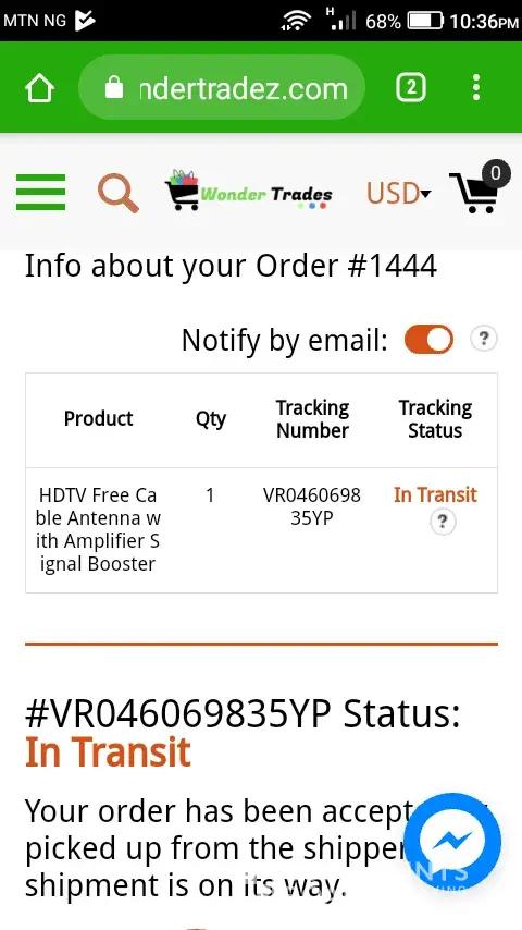 Greetings. I bought an HD antenna online with world trades on January 18th. I got an information that my package is in transit ( Malaysia to Lagos) by air on January 29th. Please what's the update. When and where am I to receive this package in Lagos.