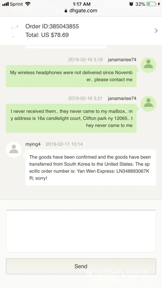 I have not recieved my package. I ordered 3 pairs of wireless headphones from DHGates and they got sent to you.. DHGates told me to get ahold of you and give you this number LN348893067k. I ordered them back in November and have still been waiting.. if you need more info please let me know and email me at [protected]@gmail.com..I sent attached pictures for you to see what's going on.. I've never had to wait this long for anything.. I recieved everything else but my 3 sets of headphone.. please let me know if you can help