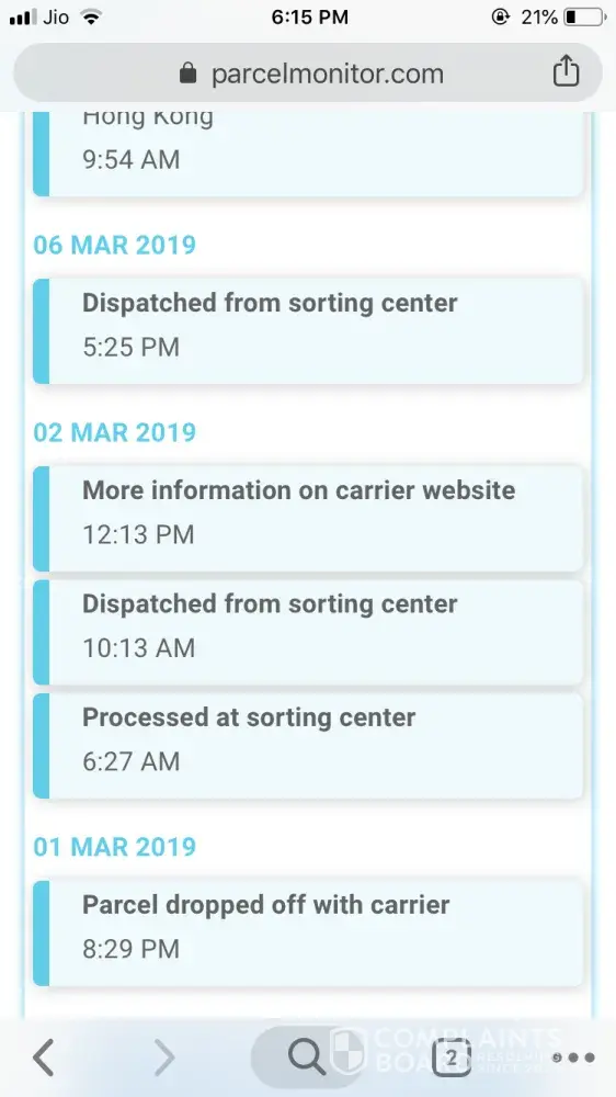 The parcel was sent from hong kong to india by hangers.in