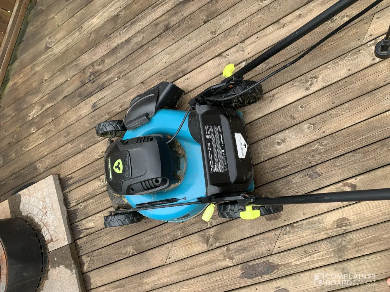 I purchased your product from Canadian Tire in Bancroft, On. on 2019. Was told it was a great product, also purchased the gas lawn mover. The first thing the guard broke, and the battery would not hold a charge. I am a 75 year old senior, so this is not from abuse.