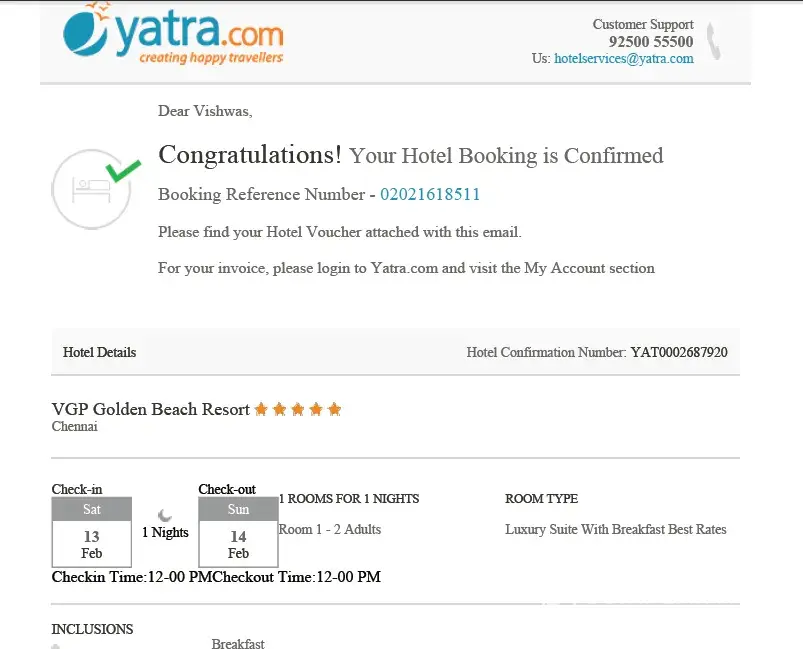 As we normally do, we confirm with the hotel a day in advance regarding the check-in and check-out time. I did the same on 12th Feb and to my surprise, the hotel manager at VGP rudely dismissed my enquiry saying rooms are all booked and i can check-in on 13th Feb at 12PM but on condition of an early check-out by 7 AM given that the hotel has an event happening and has informed all travel agents of the same. I found this disturbing and immediately called Yatra. The Yatra executive categorically confirmed the booking and told me not to worry and go ahead with our check-in and check-out at the usual time. I asked him to also revert if there are any proposed changes to which he said he would definitely do.