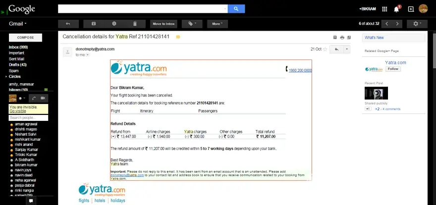 When I booked the flights the confirmation email from Yatra.com informed me that the flight was refundable and I would be charged 750rs per person and a 200rs fee to cancel the booking (amounting to a total £23). Fine I thought. Until I tried to cancel the booking.