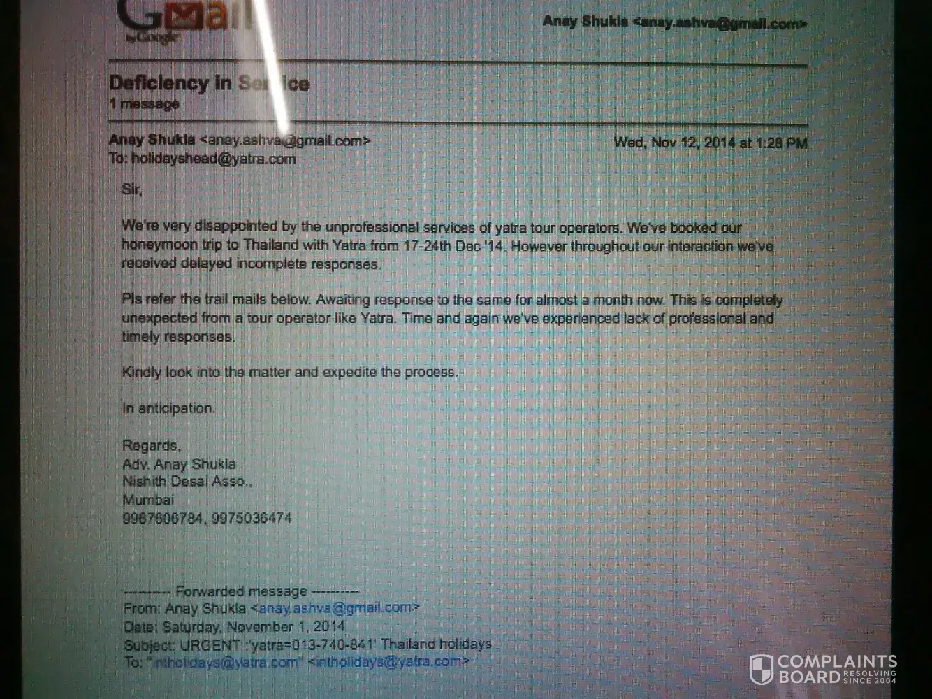 I also wrote to the complaints ID ([protected]@yatra.com) on 12th Nov at 1.28pm and haven't received any call from them YET (unlike the tall claims of Yatra that they will call back within 4 hours of complaint). After all this I spoke to Mr. Vibhor Mathur (Manager in Yatra) and told him about our grievances and future expectations from Yatra. Despite that we haven't received adequate response from anyone. We're very shocked and disappointed by the highly unprofessional and carelessness in services by a reputed name like Yatra. This deficiency in service which has cost us lot of time and mental stress, especially as this is our honeymoon we were planning. Attached is a sample mail of my correspondence with Yatra.