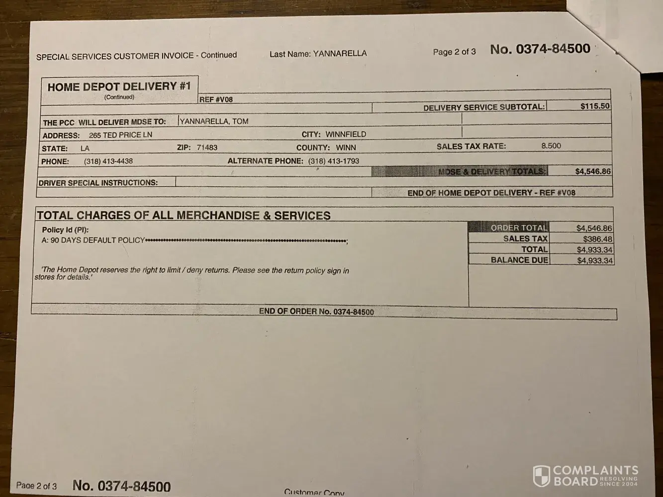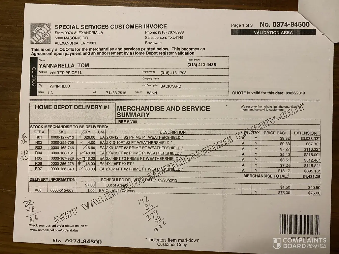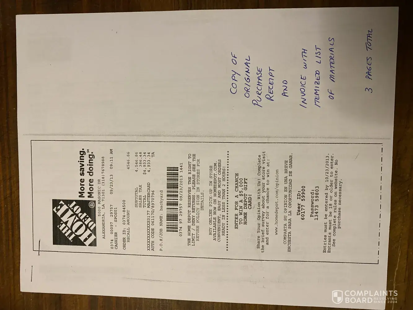 - images of original H. Depot sales receipt and original H. Depot order/invoice (3 images total)