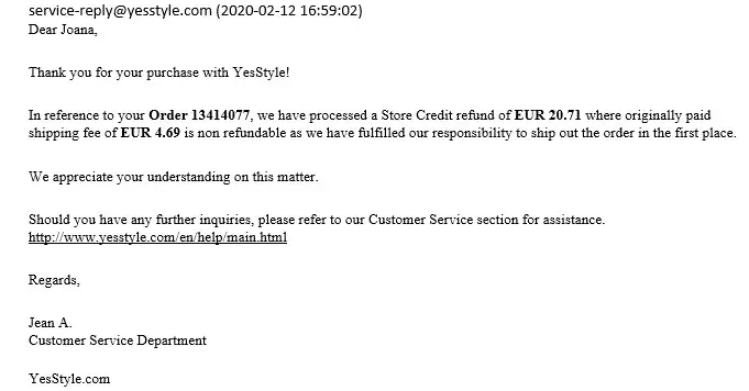 After filing for a return Yesstyle promised me a full refund on Paypal, only for 2 days later refund me in store credit. A month after I had made my order, the package had still not arrived, so I checked the tracking number to see where it was. It said that an attempt was made to deliver it to my house. I had not received any call, message, email and there wasn't anything in my mailbox to suggest the courrier had been there. I contacted Yesstyle and the courrier, and after a few days they told me the order had been shipped back to Hong Kong without my knowledge or consent. After a few emails, Yesstyle promised me a refund to my PayPal, as long as I paid the delivery fee (ridiculous, but I accepted). Two days later, they send me an email stating that they had refunded me through Store Credit instead of PayPal. I am furious, I want my money back and I will never order from this store again.