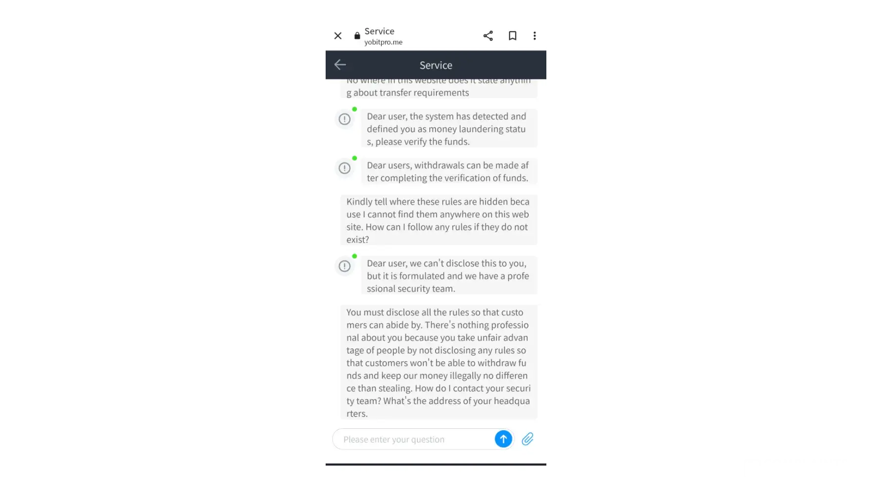 YoBItpro.me, what a bunch of crooks. They made in pay $517,000 in taxes so I can withdraw then again they rejected my withdrawal alleging that the system detected three transfers from a different IP address blockchain so it is considered money laundering and I would have to come up with the same amount of transfers which is $2,000,000 then it will no longer be money laundering? but I have to transfer that amount within thirty days or my account will be frozen. I have seven days left. I told them that I do not see any rules on their website so they answered by saying: Dear user, we can't disclose this to you, but it is formulated and we have a professional security team.