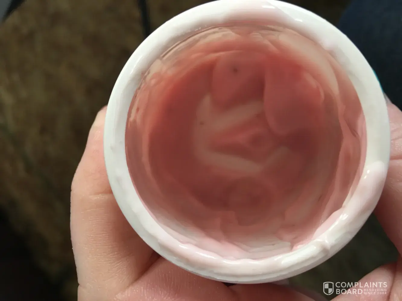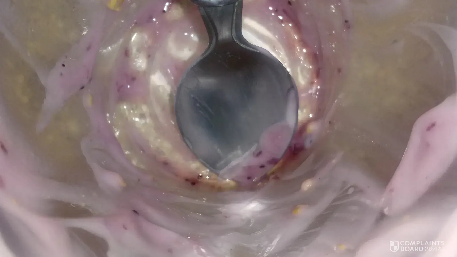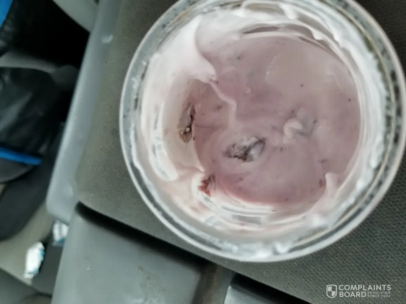 We have now had 2 yogurts that we have found something inside of them that should not be there. One had a black curly hair in it. The second, my son put a scoop into his mouth and started to spit it out. When I asked why he was doing that he said something tasted gross. He then started scooping bits of something brownish red from his mouth. I have attached a picture.