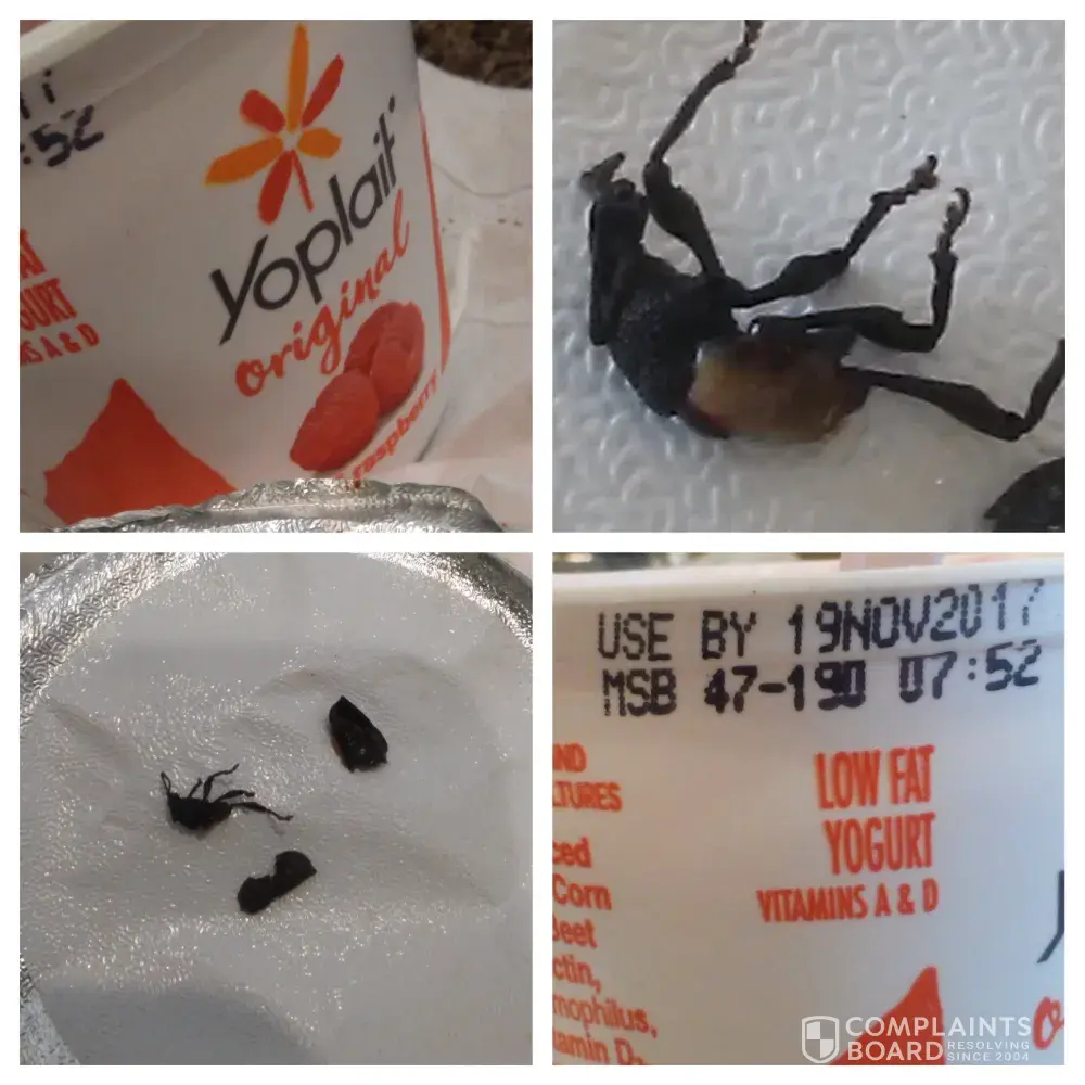 I opened a sealed container of yogurt, took two bites when I crunched on something hard, a spit it out into a napkin, and looking closer i saw that I had crunched the exoskeleton off a beetle that was in the yogurt. I don't know where the back half of the beetle is, I may have swallowed it after the crunch. I tried to contact Yoplait, but I have not heard back from them.
