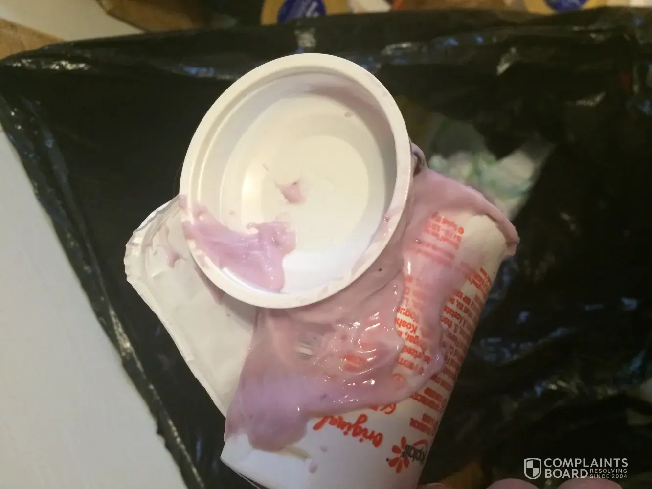 Opened up a new package of yogurt this morning. Two of the peach yogurts either had glue or dried yogurt on top of them and when I tried to remove the cardboard covering the covers on the yogurt containers opened up. Now I don't know if they were really even sealed up so I had to dispose of them. You need to make sure that your process makes sure that there is nothing that is going to stick to the cardboard and find out why it got there in the first place. I included a picture so you can see where the non-conformance was and take steps with your employees to prevent this from happening in the future.