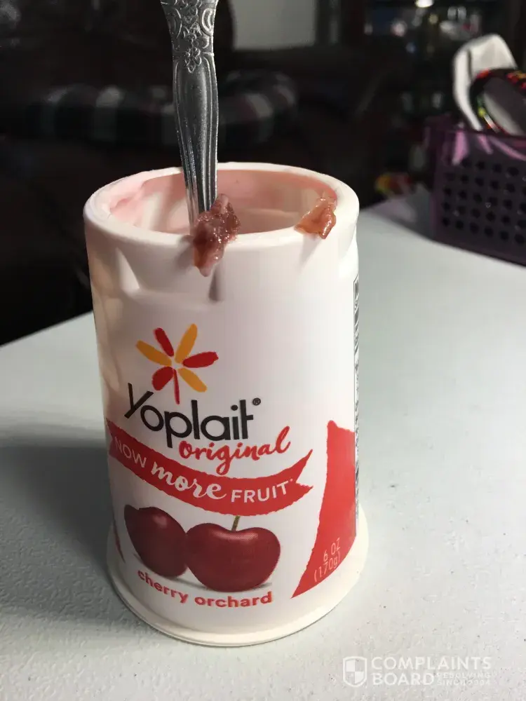 The cherry yogurt was missing the cherries! Your label states "now more fruit " Here's a picture of the fruit I received in mine. It's sitting on the rim of the cup. Very disappointing 😕 When I ate a blueberry yogurt it only had to blueberries . I paid $0.56 a piece and I know that probably doesn't seem like much but when you're on a budget it adds up. Sorry for the complaint.