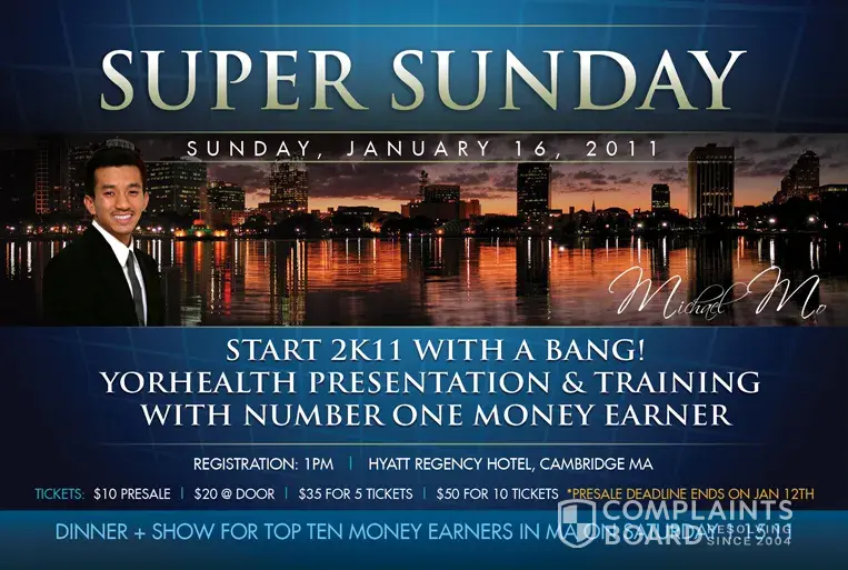 YOR Health is just another marketing company out there who found a loop hole to go around the Pyramid Scheme laws. It sells memberships more than its products. To get around the law, it's membership fee includes the products itself so that it wouldn't look as if they were dependent on membership fees only. I tell you, if you have a long lost friend who suddenly calls or facebooks you to meet up at Starbucks or a random house and asks you to bring ice or cups, then most likely it's them (YOR). They can't even afford ice SMH... YOR's senior reps like to drive benz and tell everyone they own it thru hard work. The truth is the company owns it and they only get to drive it as long as they keep their sales rating up. They or their staff like to tell you they make 5k to 10k a week, but they still live with their parents or share roommates. SMH..., Their bosses drive lambos. But the truth is, it's all image. It's all rented. When you go to their presentations, always be prepared to think ahead. They're very pushy and convincing. An ignorant person will actually think that their sales strategy works. They will tell you that if you recruit 10 people and those 10 people recruit 10 more and so on, you will make 100k a month. Sounds easy right? Well..., NOPE. if you can't survive in a brokerage firm, don't even think you will survive in a pyramid company. Look at HerbalLife, they just lost a case where they have to return 200M to their customers. Look at TelexFree, they are now indicted for criminal charge. All these CEOS who create pyramid scheme, if you look at the trend, they likes to close the companies in several years after open then open a new one with the same tactic. I can name so many of them, Word Lending Group (WLG), World Financial Group (WFG), Prime America, ALG, etc..., Bogus. If you're bogus, then join them. If not, then GO GET A REAL JOB.