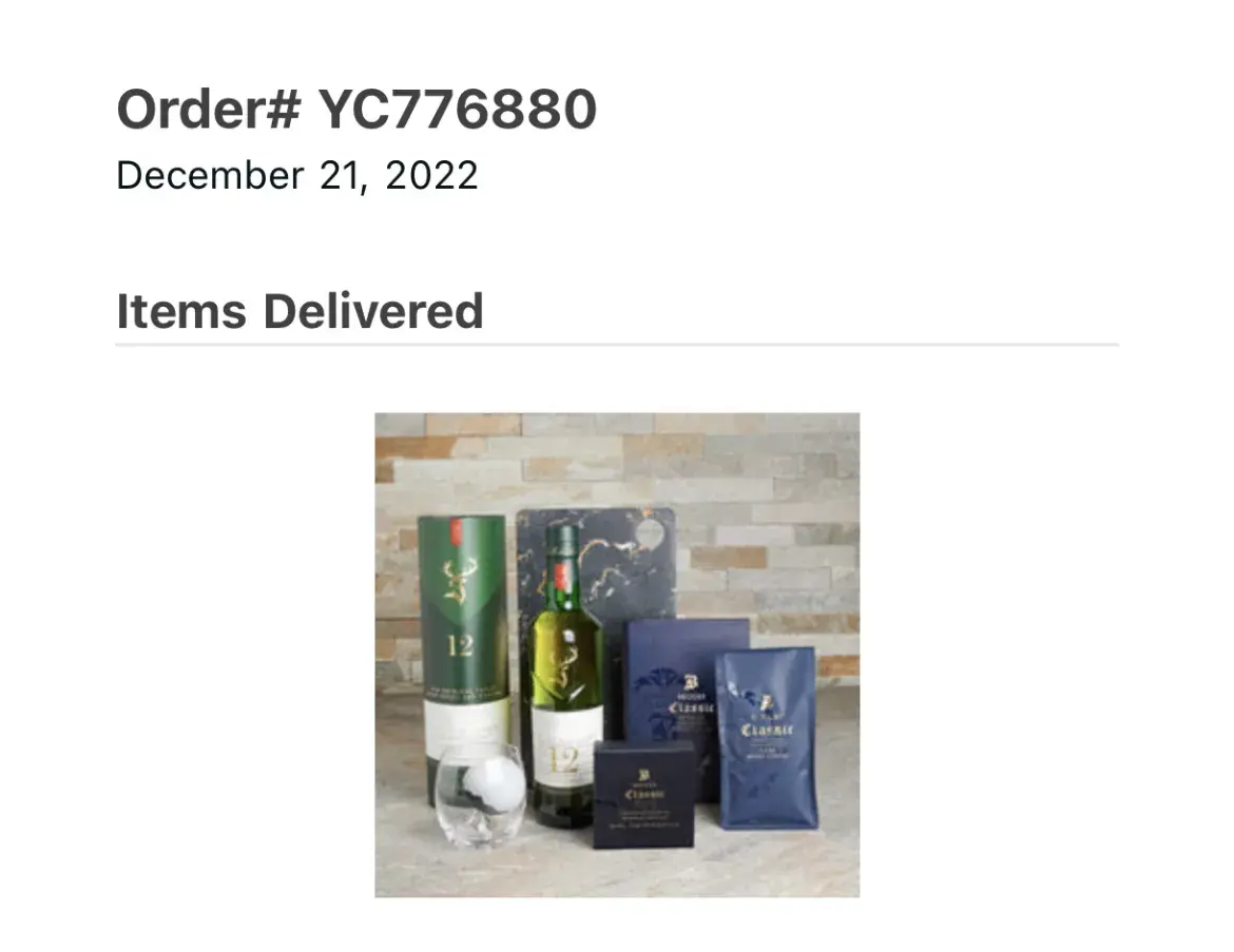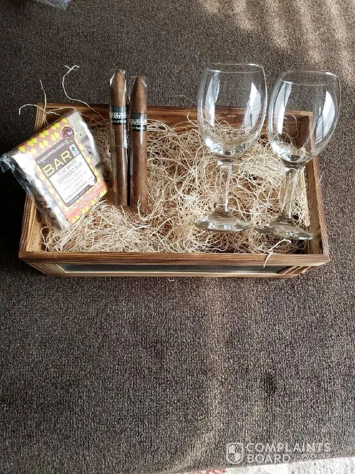 This is basically an online company with false advertising... ordered a Christmas gift basket with 12 yr old whiskey, whiskey glasses, and some munchies... what arrived was a generic sparkling wine, bottle of simple Smirnoff Vodka, and some chocolates... not what you expect right?