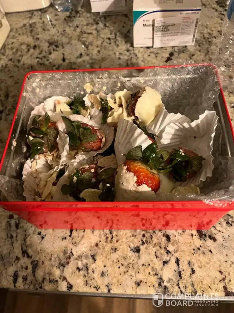 The order was delivered 8 days later, my partner had left the hotel and never received his order, more importantly: for health and safety 8 days old strawberries are not safe to consume.