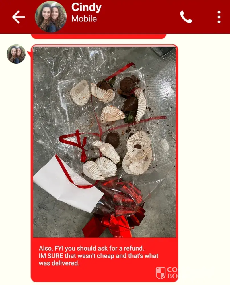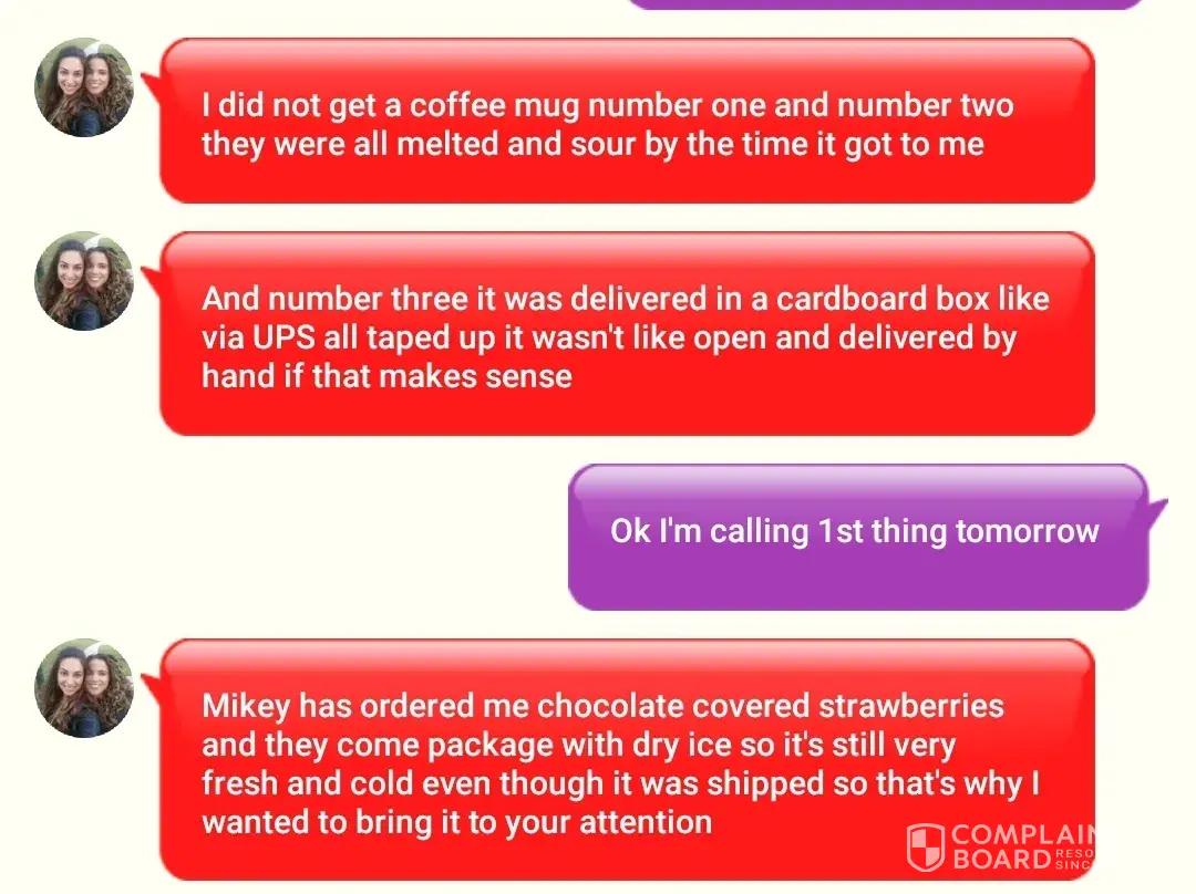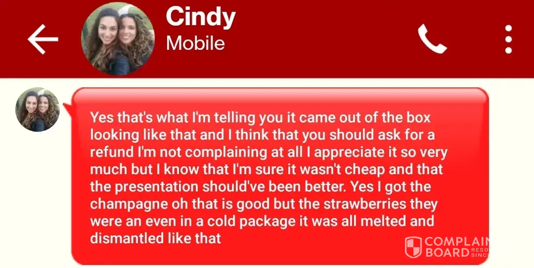 This company is a complete scam. I ordered an arrangement of Chocolate Covered Strawberries and Champagne to congratulate a friend on her new business. The arrangement was messy and falling a part and she said the fruit was spoiled. Sent an email with pictures. The reply: they can't guarantee how the arrangement would look; bad fruit requires 24 hour contact! How would I know if the fruit is bad, it wasn't delivered to me.