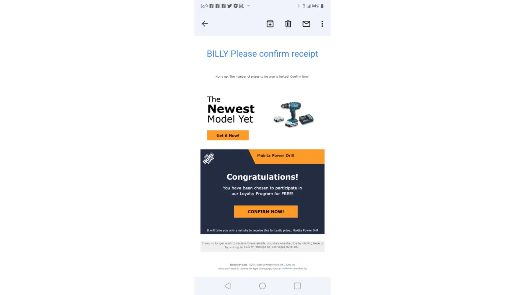 On 6/5 I received an email which said it was from Home Depot. The email said that I had won a Dewalt Power Drill. I was told that I only needed to send $1.95 for shipping.