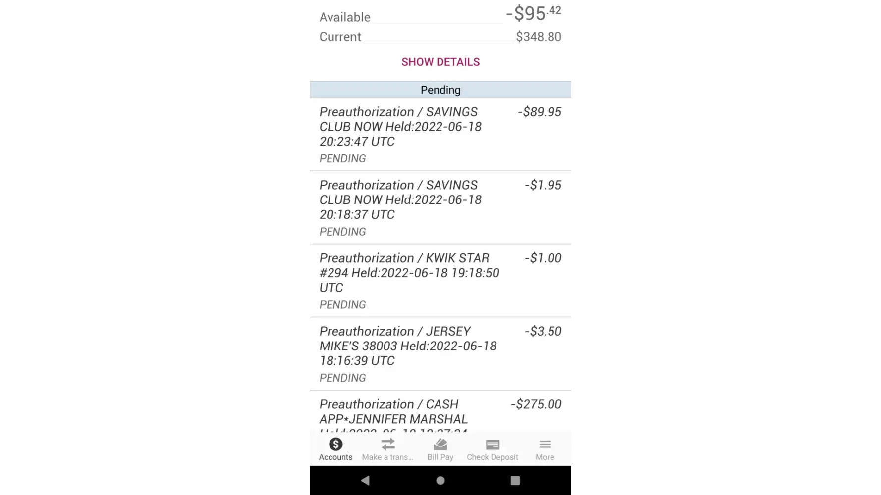 On 6/6, the $1.95 was taken from account. But that was followed by a debit for $89.95 which was not authorized. I have no idea of what the debit was for!