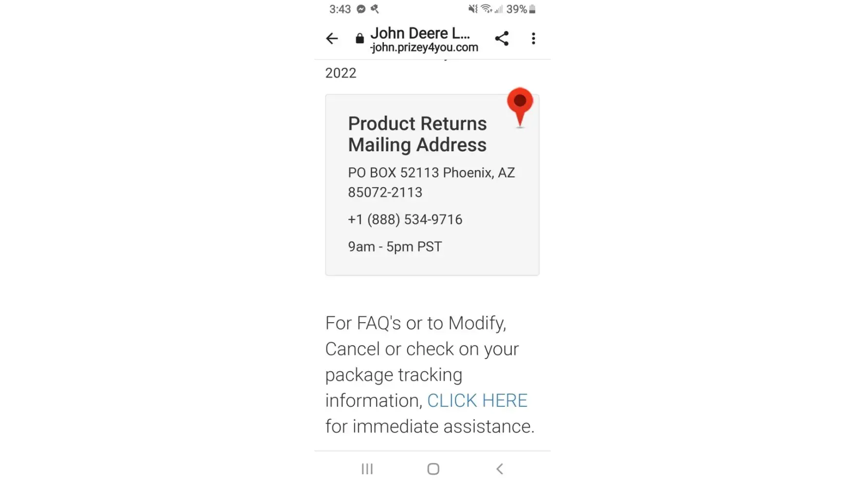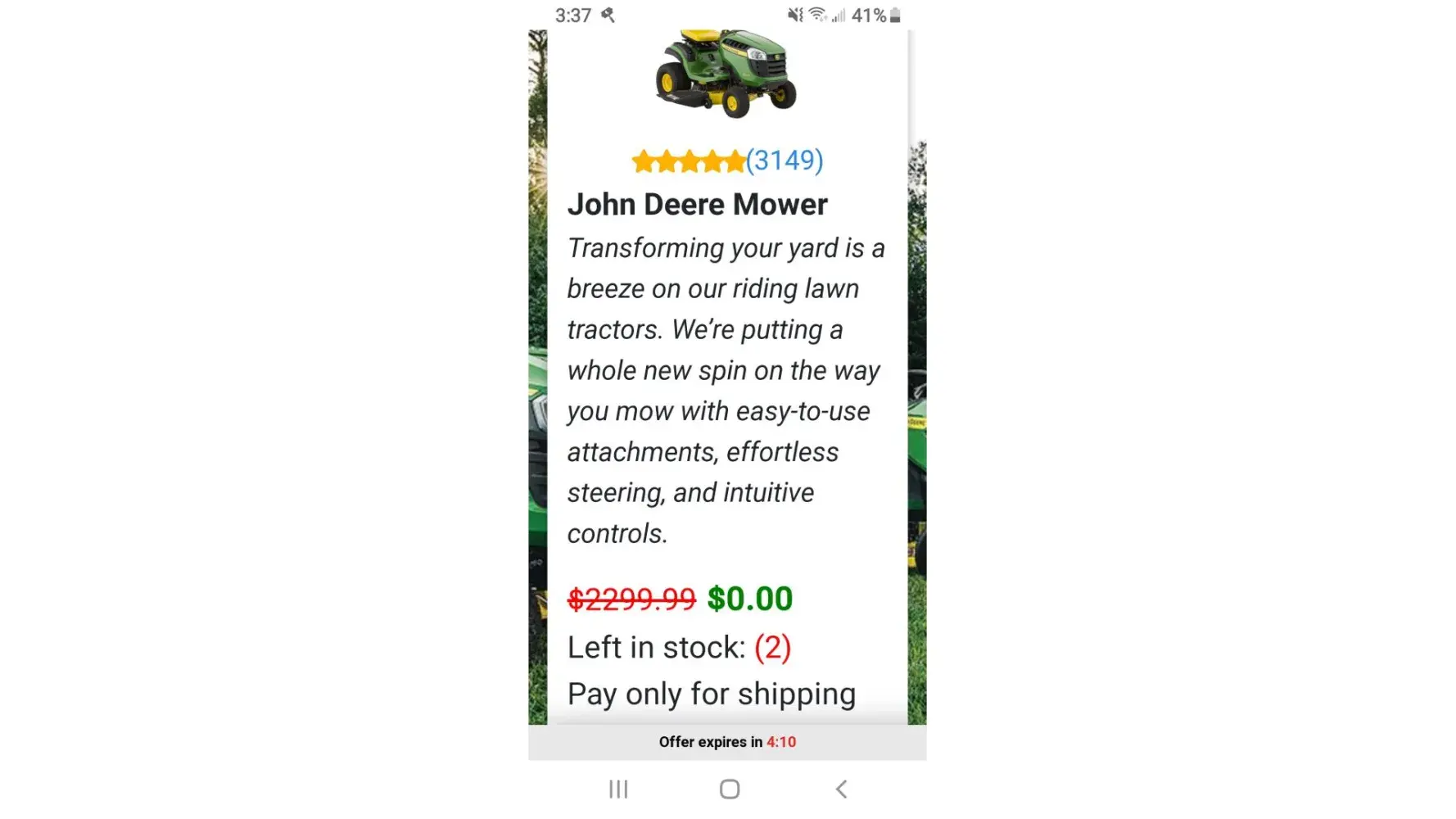 They had a promotion for John Deere lawn mower that opted for a $1.95 shipping and handling fee. I concerned to that and it charged my account then within 15 mins. Another charge came through for $89.95 that I didn’t read anything about and wasn’t informed about. I haven’t been able to find any information about this company to try and get my funds returned and cash app says it’s my own fault basically I’m beat.