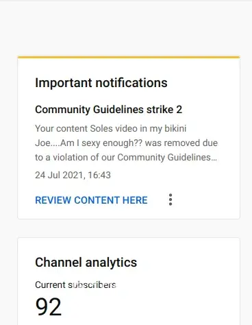 I done an unlisted live stream on my youtube channel wearing a bikini, showing my feet, doing a little twerking, youtube decided to put a strike on it saying there was nudity and sexual content... There was no nudity or sexual content in that video... I'm wearing a bikini, showing my feet and a little twerking for goodness sake!... I put my video's on unlisted, not to be shared with anyone but my husband... I could understand it if I was completely naked, saying some really obscene things but I didn't do any of that in this video... Sure I wear some flimsy underwear but i'm descrete about it... This happened yesterday 24th july 2021... My youtube channel is suaznne deer cuevas... I would like the strike removed, I didn't say or do anything wrong!... I can't even provide a picture of the video as they're not allowing me to even view it, I can only provide the photo i've attached.