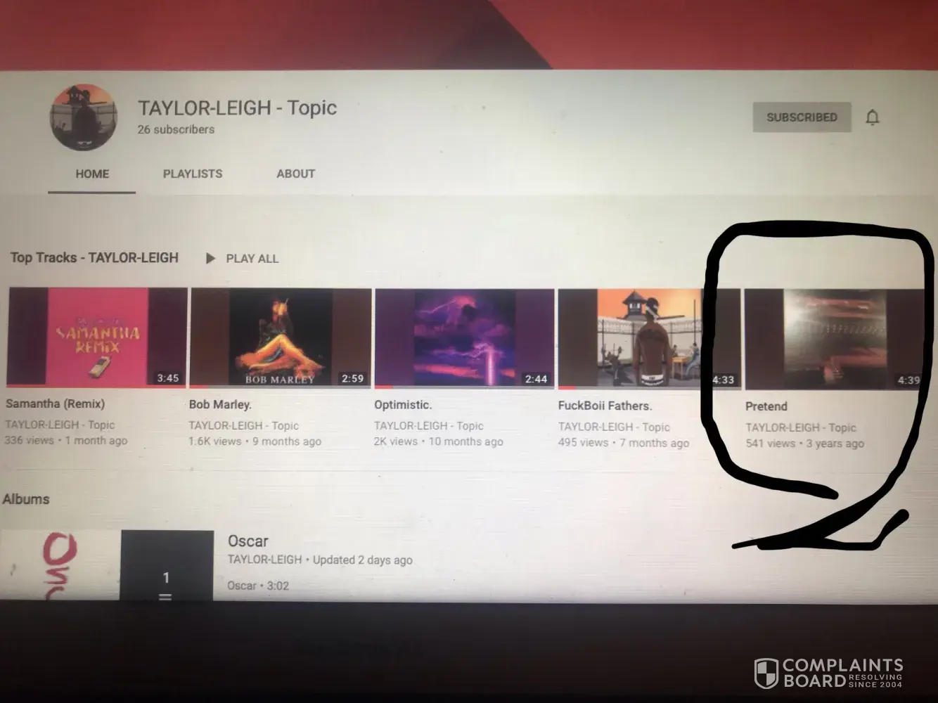 I am a musician, you can find me at ( TAYLOR-LEIGH TOPIC) on youtube distributed by (TUNECORE) there seems to be a song on my channel that is NOT MINE but sits on my channel under MY NAME TAYLOR-LEIGH the song is called (PRETEND) and seems to have been distributed via ( CD BABY) please REMOVE this song from my page and return it to its rightful owner as this is NOT MY SONG. I have added an attachment photo circling the song that is not mine. Thank you. May love, Light & blessing follow you this 2020