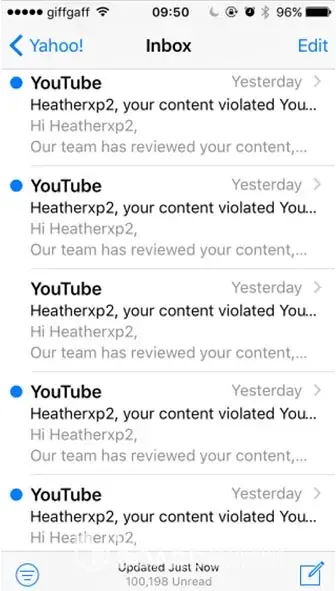 Yesterday I received a series of emails from YouTube at my Yahoo email address ([protected]@yahoo.co.uk), stating that my account had been suspended due to my content violating your spam, deceptive practices and scams policy.