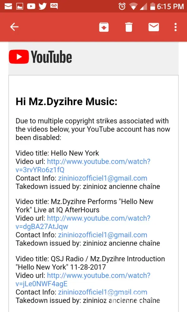 I am very disappointed in Youtube. I just had my account of 10 Yearsvdisabled because Zininioz Carrerozz a Youtube user made a false copyright claim to a song /instrumental that was created by me called "Hello New York" on a program called Soundation. I can no longer access my Youtube acount. I've submitted documentation that the music is rightfully mine and I am the owner. I also have radio station proof that he is not the owner.