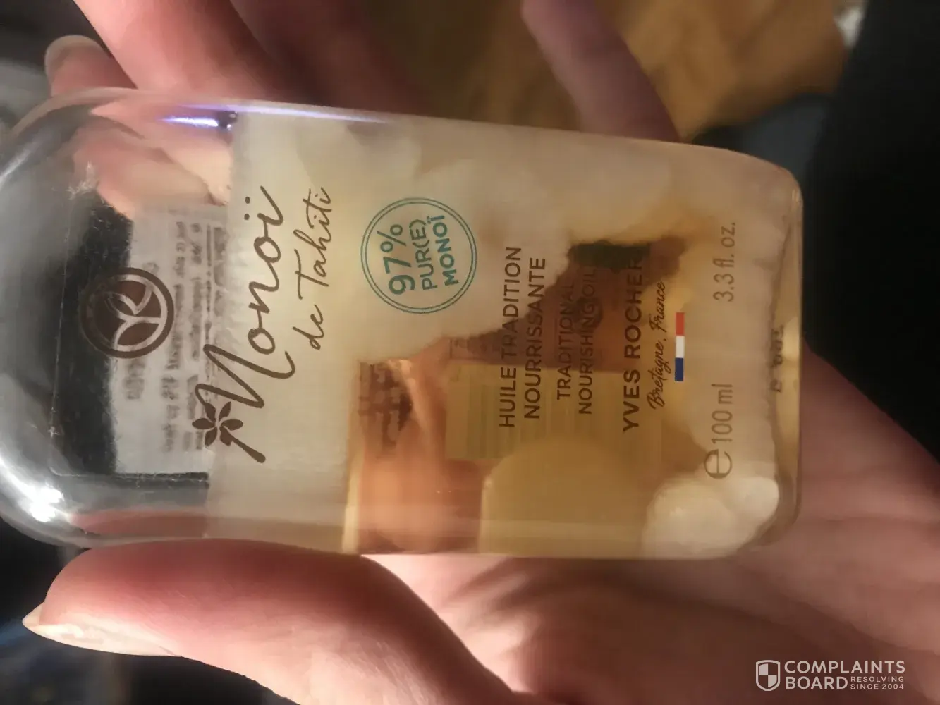 Hi, I have a product quality complaint regarding monoi de tahiti. I bought "monoi de tahiti" several months ago. I have been using it since last month. Beside I dont use it frequently today I realized that there is something inside seems like fungus. I cannot describe it well, I attached the relevant photos.