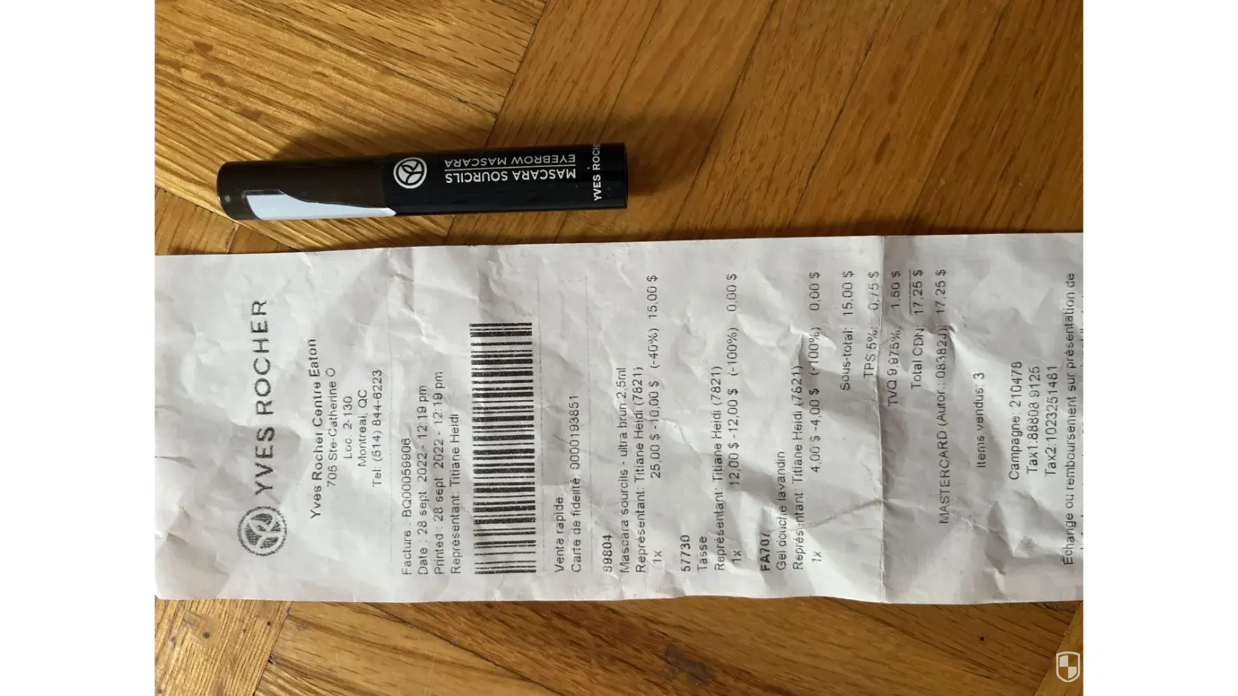 I have purchased an eyebrow mascara in the store in Eaton Center in Montreal on September 28, 2022. In order to use the product, I have the remove the plastic seal, where the paper barcode on top of the plastic was also removed at the same time. I was disappointed with the mascara because it is super dry, and its texture is like an old mascara which has been used for at least a year. The mascara bought from the store is much drier than the one I have purchased the same eyebrow mascara in a lighter color not long ago from Yves Rocher online store.