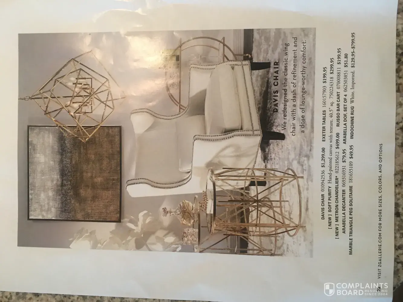 Zgallerie have the worst customer service that I have ever experience . Their product looks nice and very expensive but not worth the price . I order several items from them had issues with the item the managers never return my phone call that was 2 months ago . I called several time again to speak to them they said they will have to call me back and put me on a Q list still to no avail . In addition costumer service was suppose to give me a gift card via email nothing has shown up . They need to be out of business . I will now do all my shopping on Wayfair their customer service is one of the best they will never leave you unsatisfied