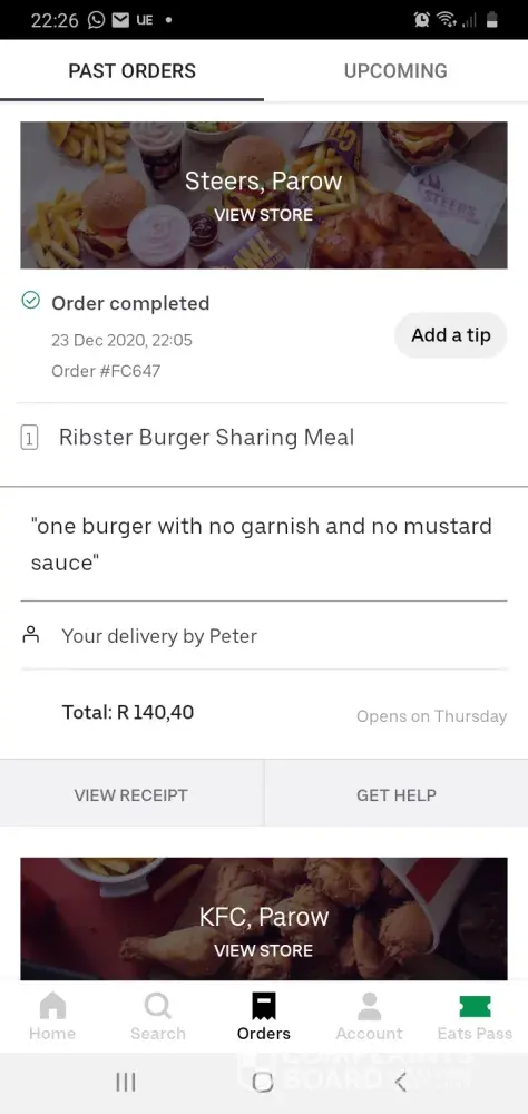 I order 4 ribster burgers with 2 medium chips from uber eats with special instructions stating that only one burger shouldn't have garnish and no mustard. When I received my order none had steers sauce or mustard sauce only the burger, buns and a little bit of sprinkled onions and there were no tissues or sauce given along with the burgers and on top of that the chips were cold too and not spiced at all