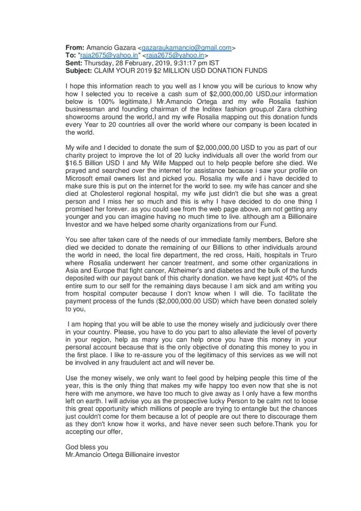 Billionare Amancio Oretega as per will of his deceased former wife whose photograph is attached herewith selected me one out of 20 donation winners to improve the poverty as per detailed his wife's will letter herewith.