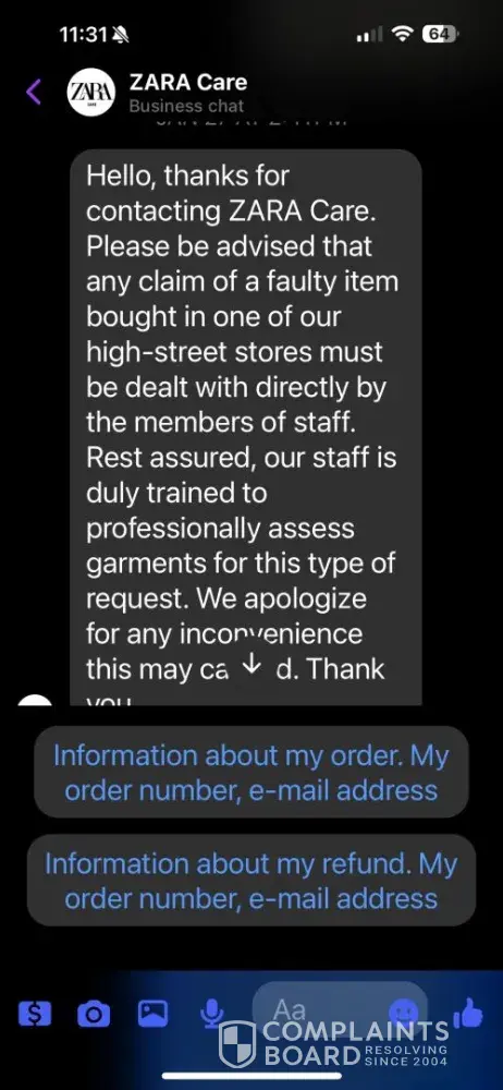 I visited Zara in Westfield Stratford, London, to return the item, but was rudely told that they were not able accommodate my request. I was instructed to conduct a WhatsApp chat, and throughout several exchanges I supplied proof of purchase and the evidence of the many attempts to exercise the return. All I kept receiving was an repeated message that I was attempting a return outside their 30-day policy. I continued to protest that I had been actively engaged in this return well within the return period, but all I received was a robotic answer repeating the 30-day criteria.