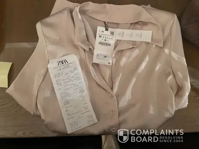 Once I had the top on I realized it had been worn by someone who was obviously too large for. The fabric was stretched in the front, back and the button holes. It was disgusting and I took it off and contacted ZARA to let them know. They said they would not take it back because their policy of cutting off the tags. I asked what their policy was on selling used clothing? This is fraud. They asked me to send pictures and I did. They came back with their policy of not refunding clothing that has the tags clipped off. I asked if they needed them on because they were going to resell this blouse again? This is fraud. They are getting away with it on a technicality.
