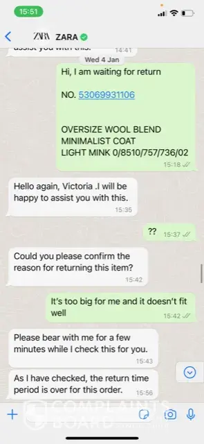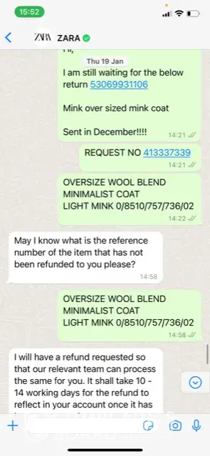 I returned items from zara in one box, all items besides one were refunded to me on the 23/12/22. On the 2/01/23 I chased the missing returned item om Whatsapp, where someone told me 'As I have checked, the return time period is over for this order.' This was obviously incorrect, therefore I called to speak with someone that week over the phone. The person on the phone informed me that the coat was refused and said there was a tracking number that will be sent to me for it to be shipped back. The item was not worn, with tags, in the same condition as returned. I did not receive anything from zara with regards to the tracking/return shipment. On the 5/01/23I then reached out on whatsapp again with a similar response to before where I was told when the item was purchased an therefore was out of policy. Again, not true as stated previously, if they had actually worked the dates out they would know this information they are providing is in fact incorrect. Then on the 19th I got in touch again on Whatsapp where someone finally says 'I will have a refund requested...It shall take 10-14 days for the refund to reflect in your account'. This hasn't happened. I then messaged and called today 1/2/23 for someone to say that the item hasn't been received. I've been poorly informed 3x times, and still no refund. I suspect they don't check CCTV if they have it in order to follow up customers complaints correctly however, I want to receive the money for this item back, or the coat. Either way, I am at a loss with this item.