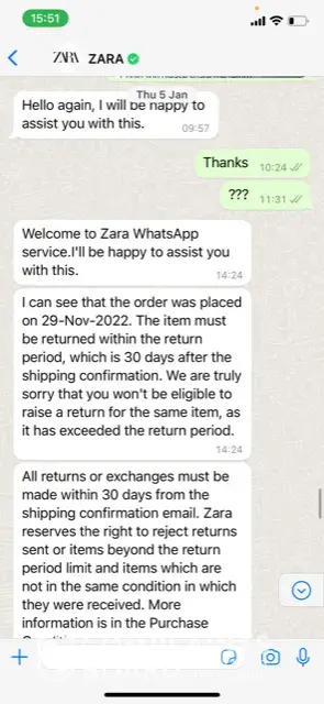 Really disappointing service as I have been a loyal Zara customer for years and never had a problem.