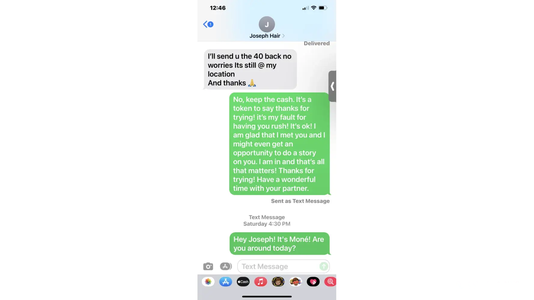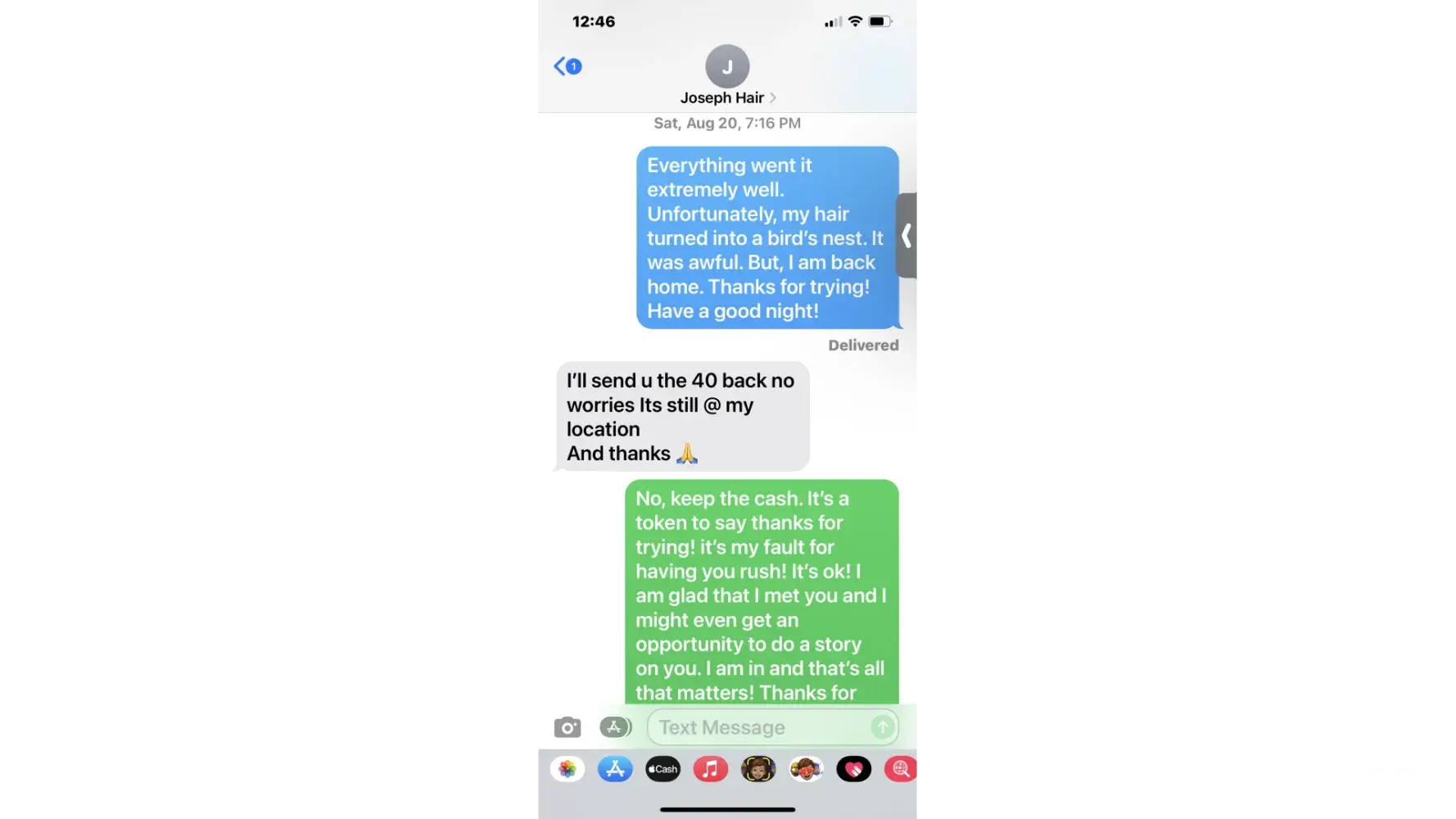 Part three, I thanked him after the event via text and told him that my hair looked awful. However, I appreciate his efforts and I closed the deal. Joseph responded that I could come back and get the $40 tip I gave him. I responded no just keep it. You came early to help me.