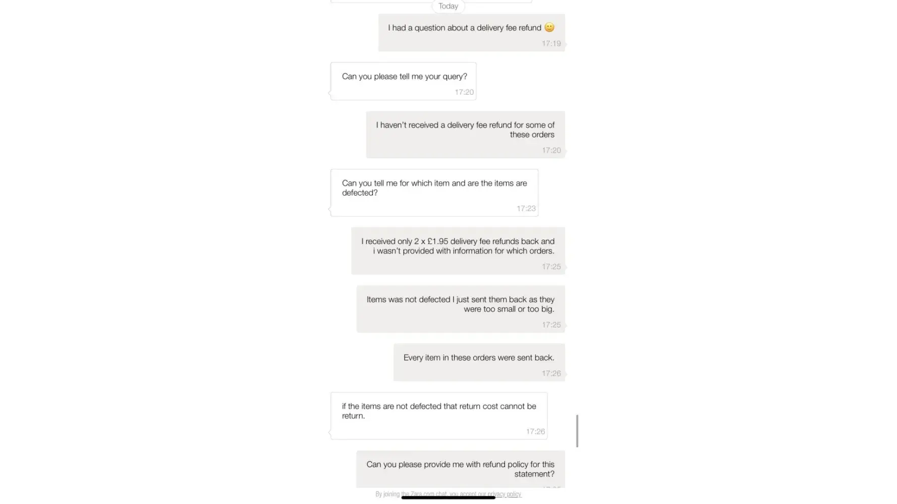 I'm a loyal customer of Zara for many years and haven't encountered anything like this before. It really makes me think that Zara is employing young people who are not competent in customer service and not knowledgeable in the Terms and Conditions of the company, which is really sad.