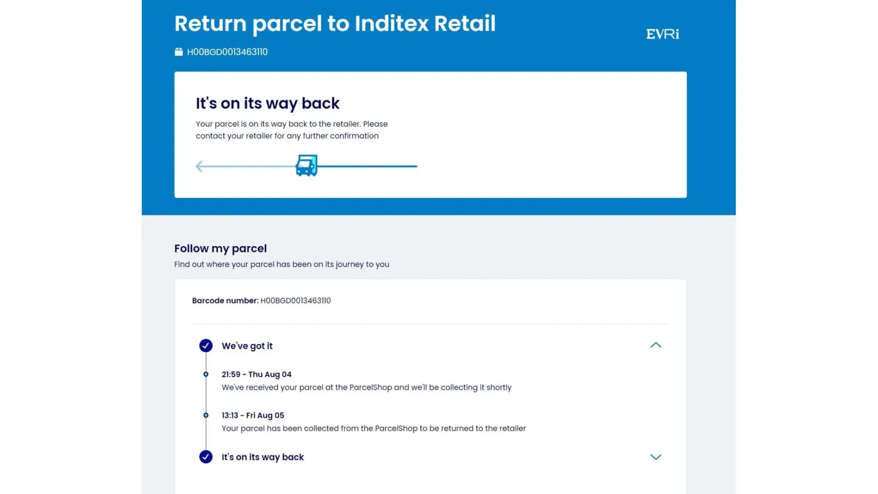 Dropped off at parcel shop on 04/08. Evri Tracking Nos below.