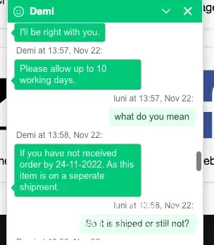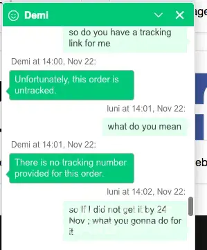 I have lost count of the amount of chats via text with apologies saying it will be sorted and as yet I have no goods and I’m down so much money I don’t know what else to do.
