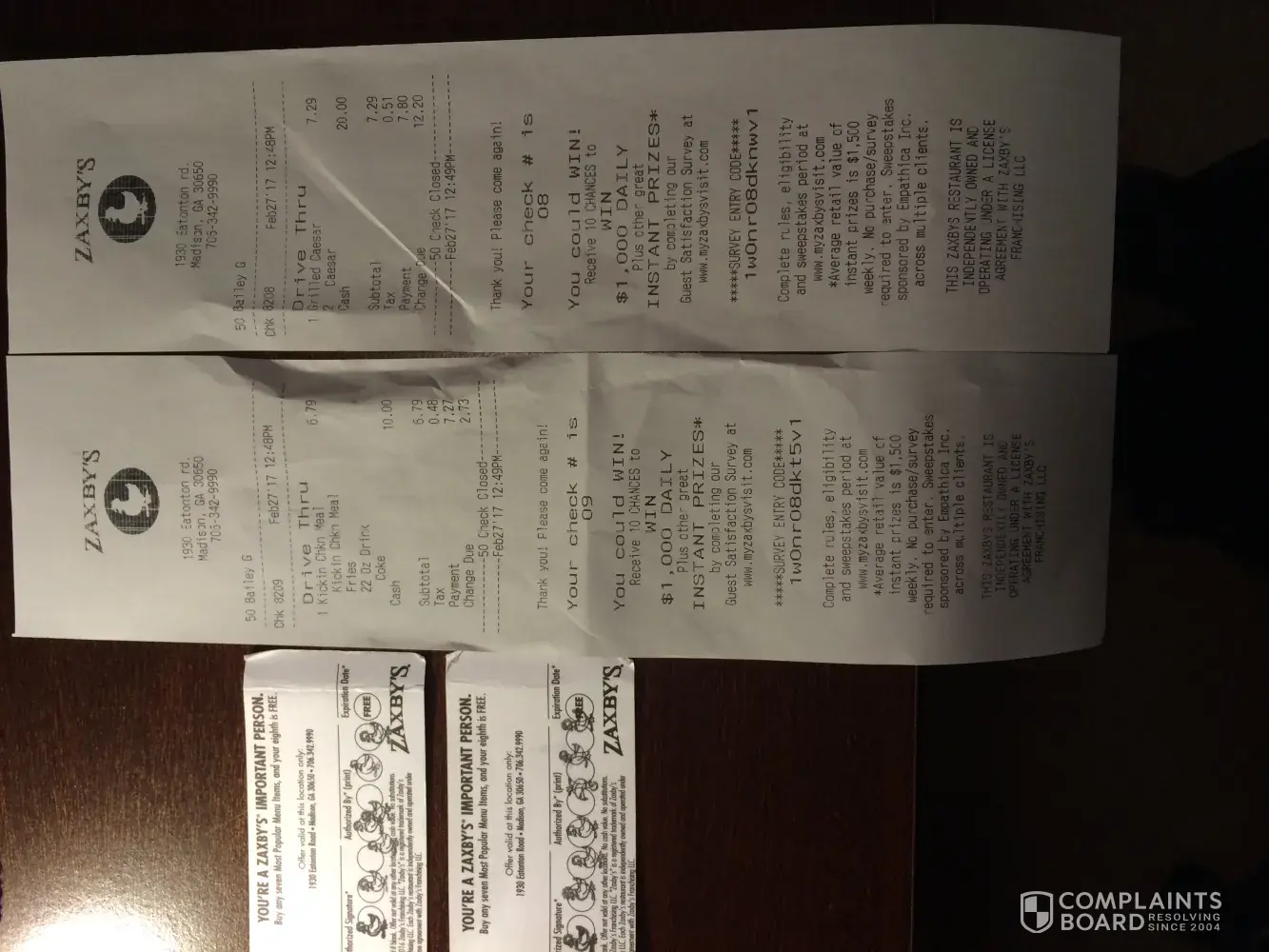 2.27.2017-#50 I tried to use my 8th meal free coupons (2) and was told they were no longer valid. Yet the manager just last week stamped our 7th visit and said, "Your next visit will be free!" I ordered at the drive thru telling them I had the free meal coupons and no one told me they were no longer valid, get to the window after I had ordered Kickn Chicken and a Caesar salad and was told I couldn't have the Caesar salad with the free coupon, so I ordered wings, then was told neither meal was going to be free because my coupons weren't valid. Why did the manager just tell me a few days ago our next meals would be free? That was misleading to say the least, not to mention the treatment I got at the drive thru. Then I gave her $20 to pay for the meal and got the wrong change back. Looks like she gave me 2 different receipts? I got $4.00 and some change back for 2 drinks, Kickn Chicken and a Caesar salad. See attached coupons and 2 receipts. One of the receipts says I gave them $10 cash? Figured that one out?