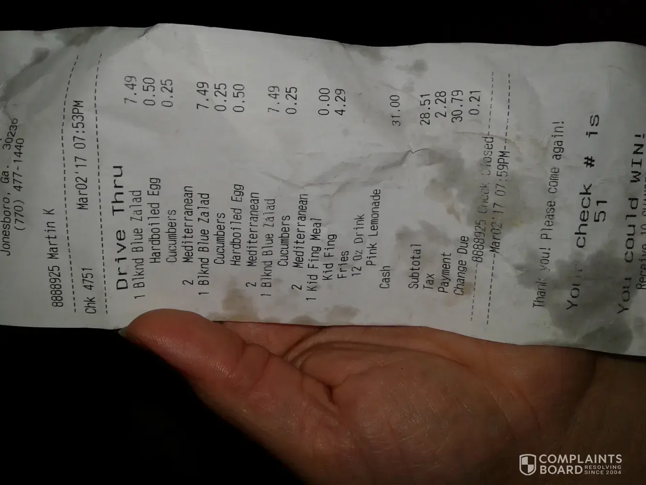 As a resolution, we would like our 2 free meals and I think we are owed a little more money back from that transaction, a little under $2.00 I think. We eat there a lot and now have negative feelings about this location.